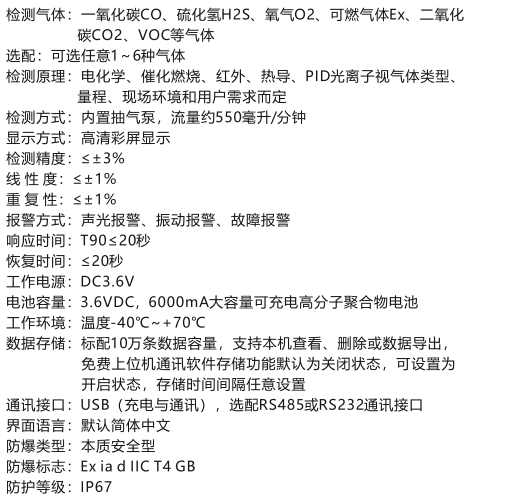 防護級別IP67,本安電路設計,防爆、防震,抗靜電,抗電磁干擾:·采用國際著名品牌氣體傳感器,高靈敏度及穩(wěn)定性好;可擴展到6種氣體同時檢測;