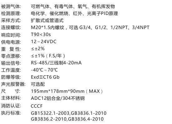 結(jié)構(gòu)模塊化、維護(hù)方便,接線安裝簡單國瑞智能傳感器平臺(tái),可即插即用,無需現(xiàn)場(chǎng)標(biāo)定快速響應(yīng)、測(cè)量精度高,運(yùn)行穩(wěn)定的檢測(cè)儀器通過防爆認(rèn)證、防護(hù)等級(jí)IP65、防腐蝕性高、抗電磁干擾豐富的傳感器量程選擇,可以滿足客戶的要求智能傳感器平臺(tái),可即插即用,離線標(biāo)定LCD實(shí)時(shí)顯示氣體濃度,有儀器狀態(tài),故障和通訊異常提示功能可設(shè)置高低報(bào)警點(diǎn),兩級(jí)聲光報(bào)警兩路繼電器可以控制外圍設(shè)備(如風(fēng)機(jī)和聲光報(bào)警器)動(dòng)作產(chǎn)品選擇材質(zhì)優(yōu)秀,具有良好的密封性,防腐性,防爆和抗磁干擾強(qiáng)儀表具用4-20MA輸出與RS-485輸出可以與GRI-8000系列和GRI-9800系列報(bào)警主機(jī)組網(wǎng)使用可以與GRI-9802單點(diǎn)報(bào)警主機(jī)組網(wǎng),每點(diǎn)匹配,點(diǎn)點(diǎn)組合。